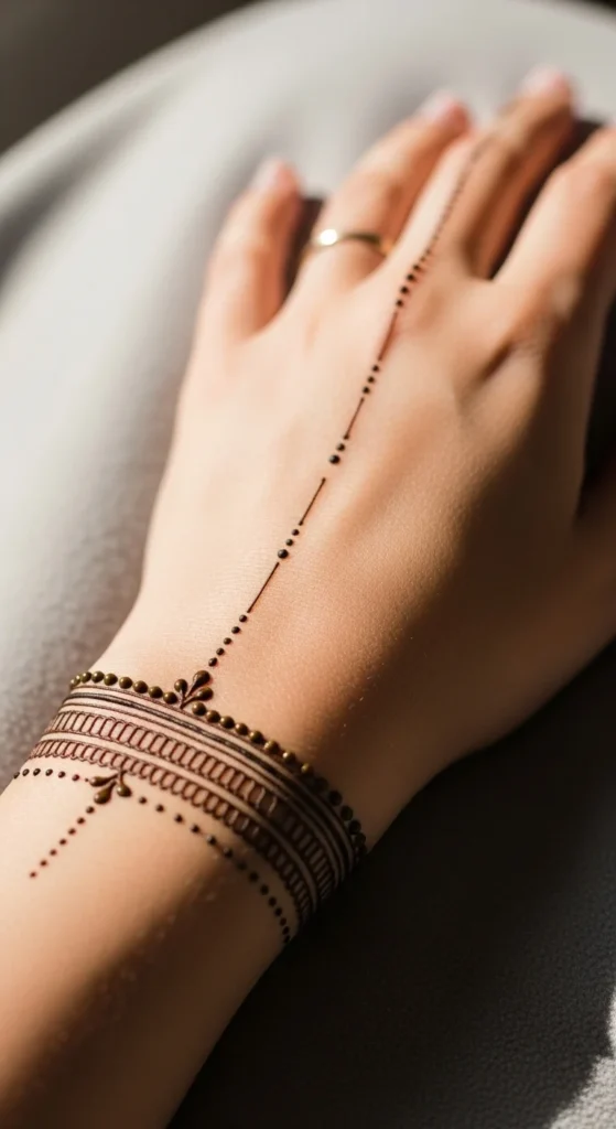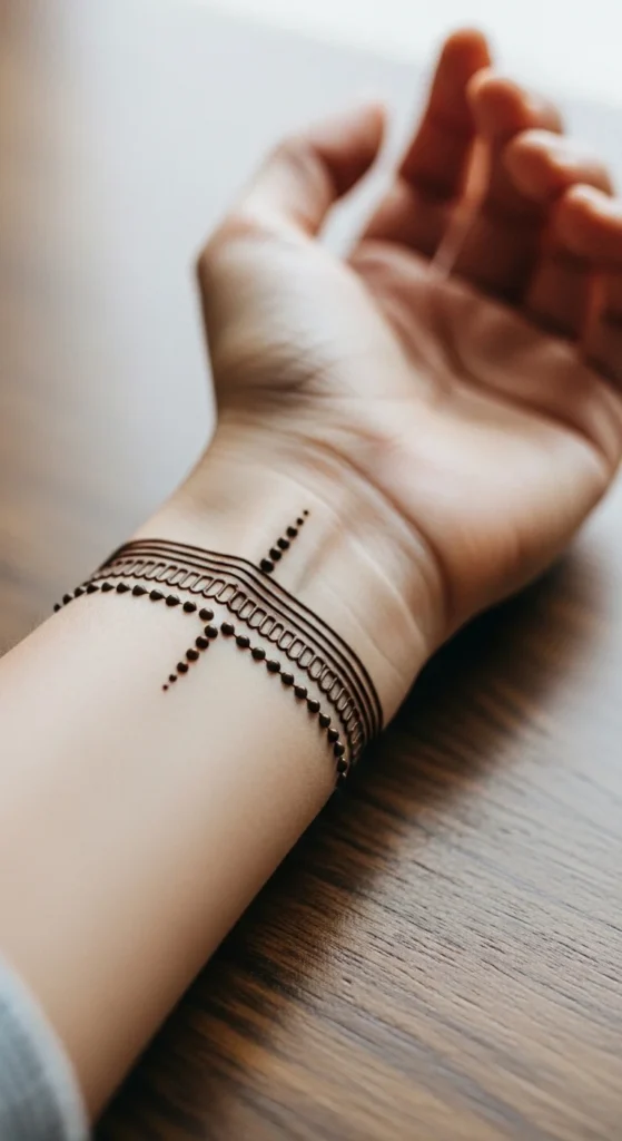 A fine line wrist band is one of the easiest minimal mehndi styles to create. It looks neat and modern without covering much skin. The design usually runs around the wrist like a bracelet.