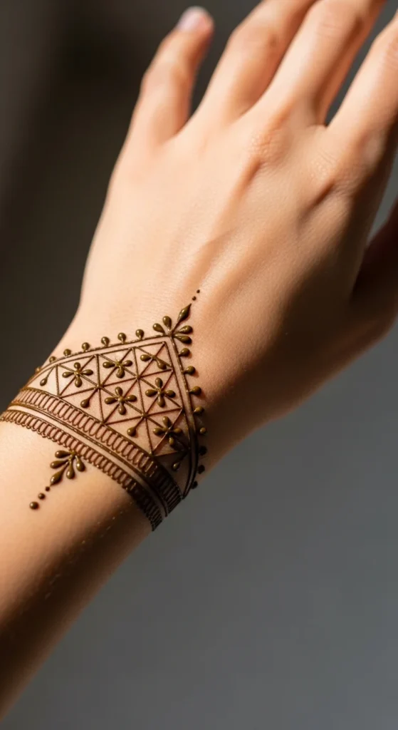 Geometric patterns give mehndi a modern personality. Triangles work especially well for minimal designs.