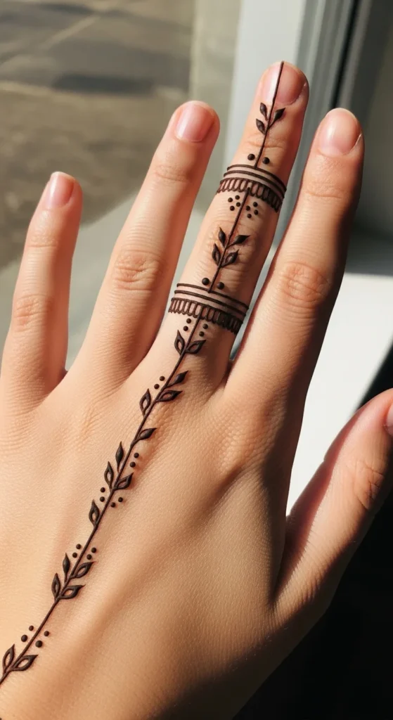 Begin with a thin line starting near the finger base. Then add tiny leaves or dots along the line. Keeping the pattern narrow keeps the style modern.