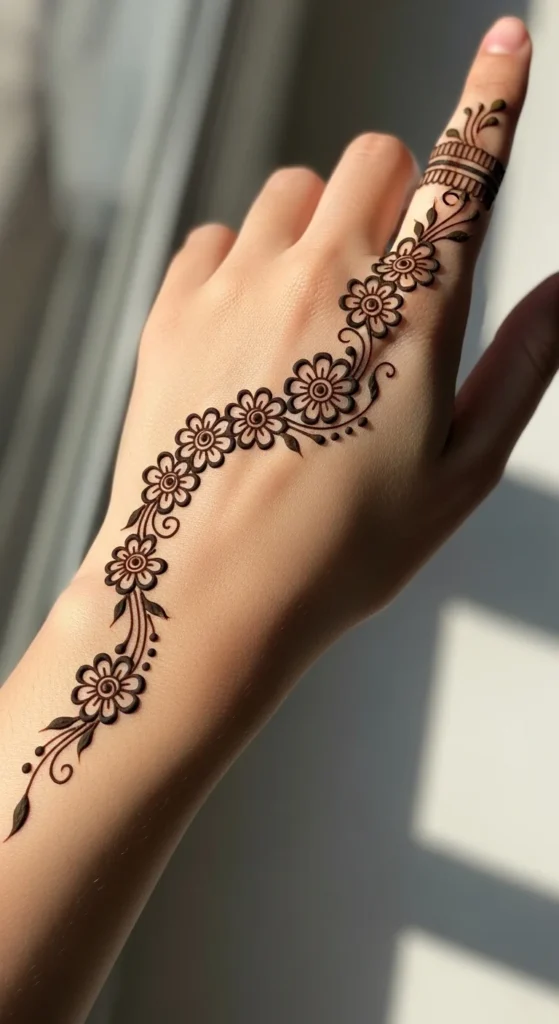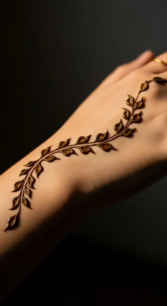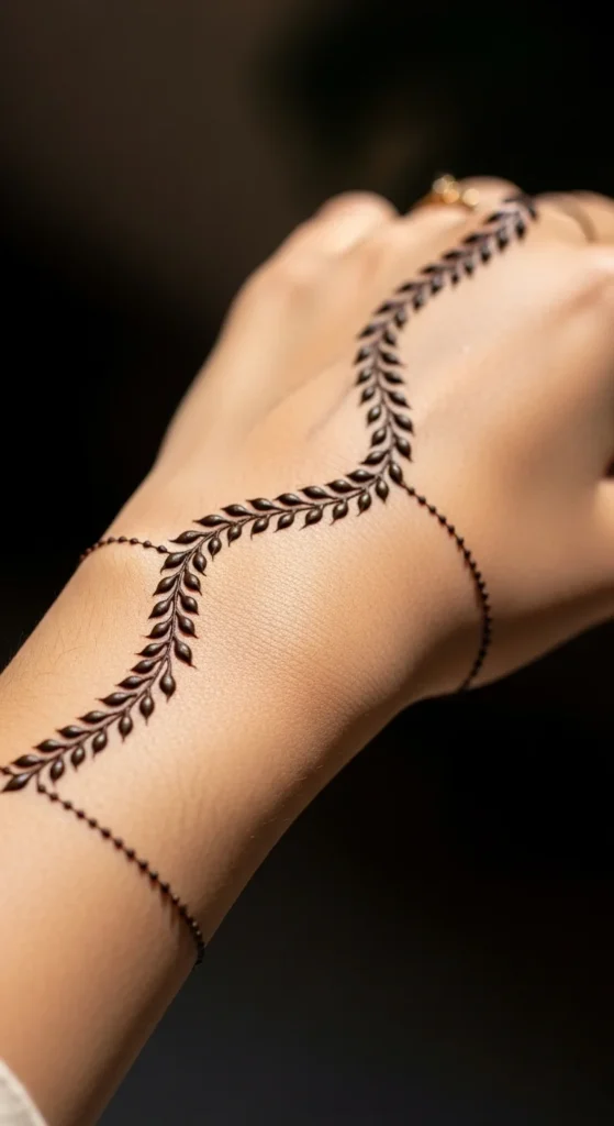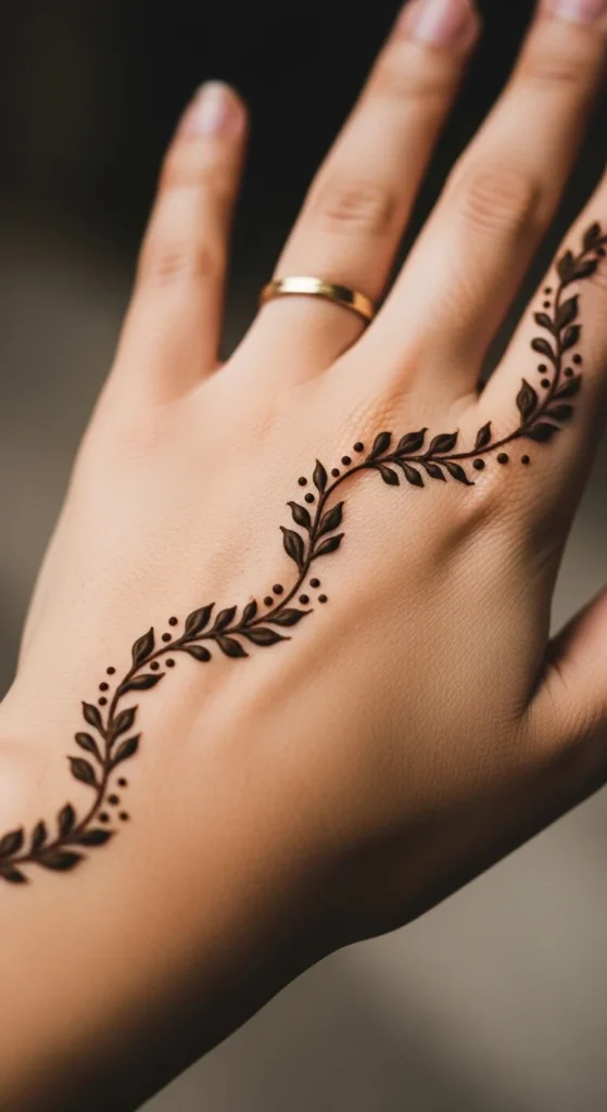 A single vine flowing across the hand creates a graceful look. It feels light yet decorative.