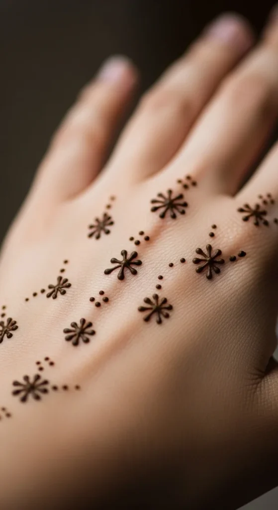 Minimal mehndi designs show that simple patterns can still look elegant and stylish. Thin lines, tiny florals, dots, and geometric shapes create beautiful body art without covering the entire hand.