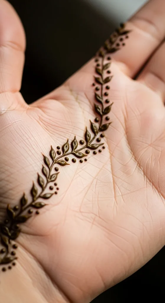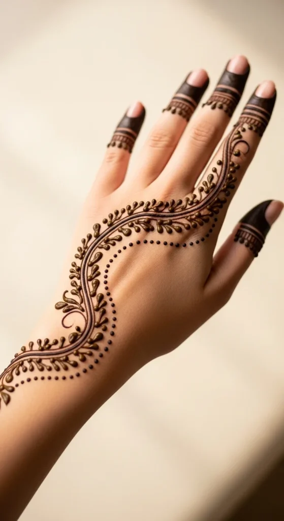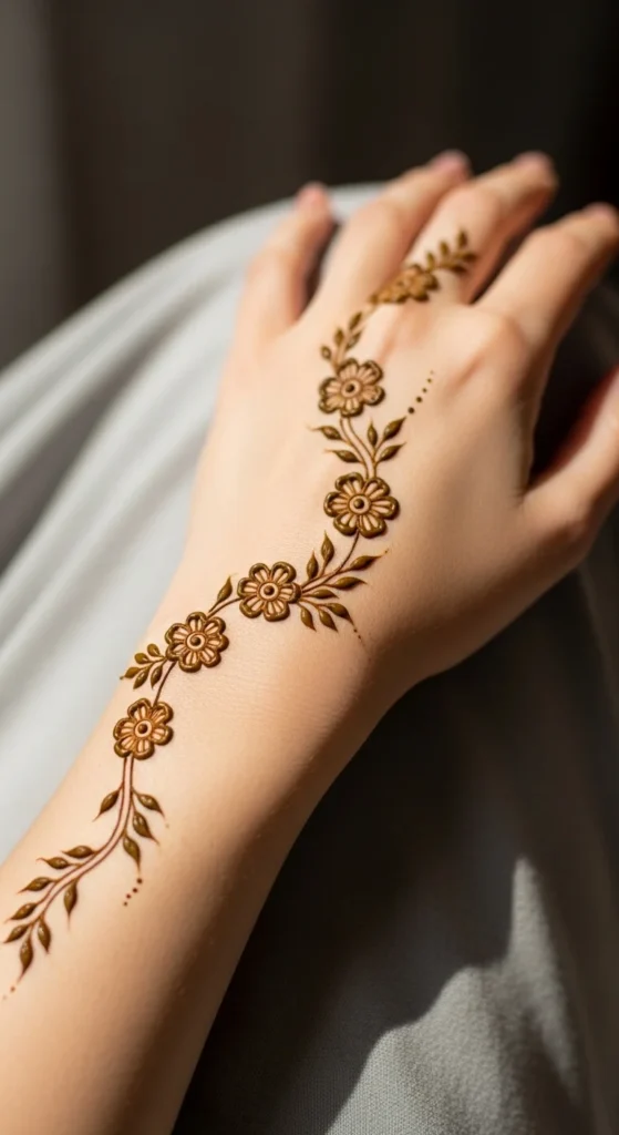 Floral vines remain one of the easiest mehndi patterns for beginners. The design flows naturally across the hand and does not require perfect symmetry.