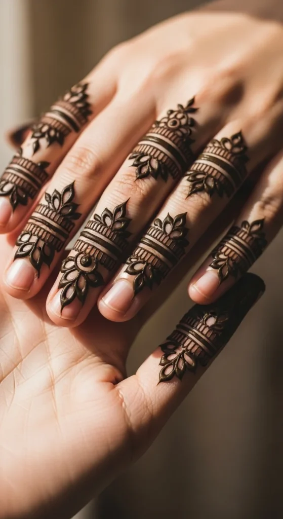 If you want extra detail, draw thin rings of henna across the finger joints. These simple bands look beautiful and take only seconds.