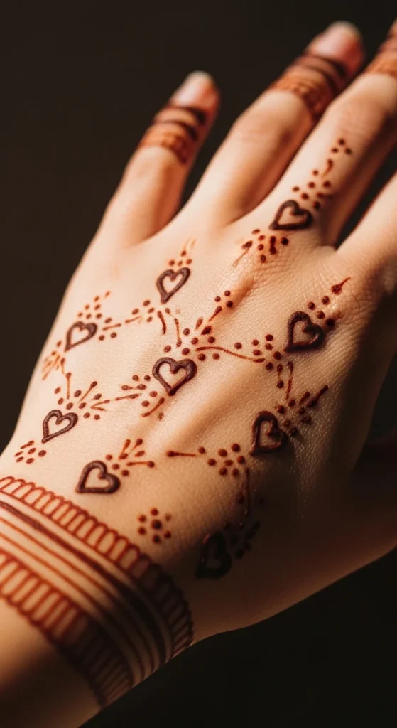 Tiny heart patterns bring a playful feel to simple mehndi designs. They are easy to draw and work well for beginners.