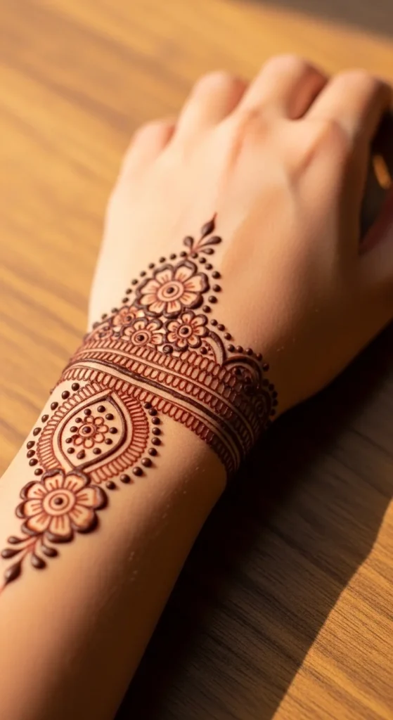 A wrist bracelet mehndi design looks graceful and works well with traditional outfits. It mimics the appearance of jewelry made from henna.