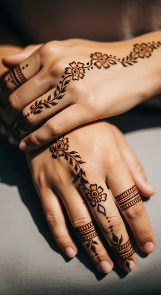The ideas below focus on practical, beginner-friendly mehndi styles that anyone can recreate. Each design uses small elements like vines, flowers, dots, or geometric shapes. With a bit of practice, these patterns can turn plain hands into graceful works of art.