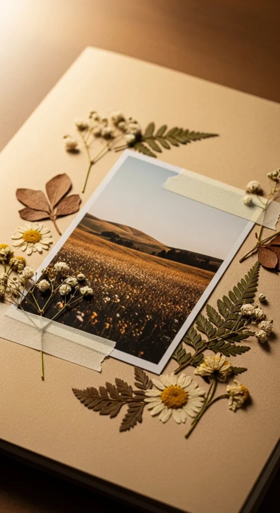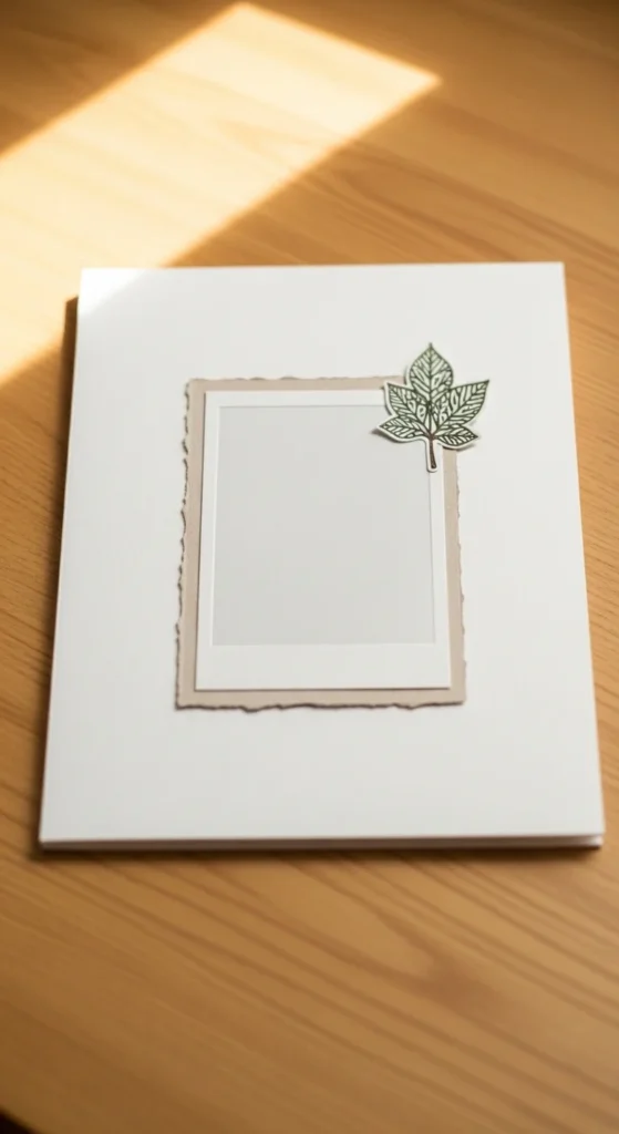 Place your photo slightly off center. Then add simple decorations like dried leaves, twine, or neutral tape.